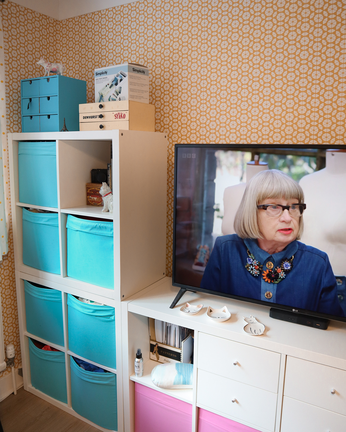 The Kallax units double as a tv stand and hold all my fabric, papers, buttons, machine accessories, pressing hams and clappers, plus many more awkward size items! Each drawer is filled with either interfacing of different weights or zippers. The ridiculously large television was given to me FREE when we signed up to a tv provider. I don’t really need something this big in my sewing room but I tell you what, it is fun to watch Sewing Bee on! Are you ready for the new series starting next week?